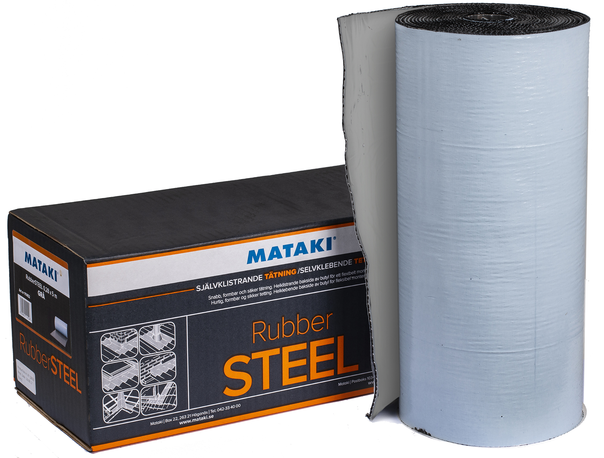 Mataki Rubber Steel er et miljøvennlig og fleksibelt inndekningsbeslag på rull, som er meget enkelt, raskt og sikkert å bruke, takket være den selvklebende baksiden. Produktet består av strekkmetall innstøpt i en miljøvennlig polymergummi. Rubber Steel er derfor velegnet til både flate og profilerte taktekkingsmaterialer.